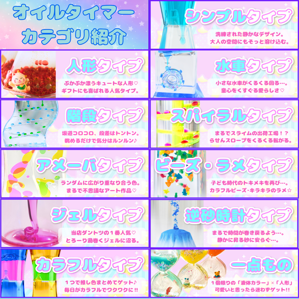 有名なのは「水車タイプ」や「階段タイプ」ですが、他にも「スパイラルタイプ」「ジェルタイプ」など、実は魅力的なオイルタイマーがいっぱいあるんです!!(*^^*)
